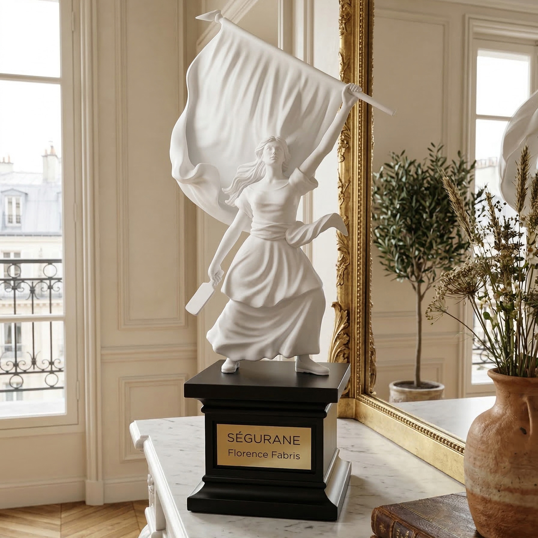 Cette photographie d’art met en scène une magnifique sculpture blanche et détaillée de Ségurane, œuvre de la sculptrice française contemporaine Florence Fabris. La figure féminine allégorique est représentée dans une pose héroïque, tenant une grande bannière flottante, symbolisant la liberté. Elle repose sur un socle noir orné d’une plaque dorée gravée des mentions ‘SÉGURANE’ et ‘Florence FABRIS’. La sculpture est le point focal d’une décoration intérieure méditerranéenne chic, placée sur une console moderne au dessus en marbre. Le décor environnant, avec un fauteuil bleu velours, des branches d’olivier et une vue imprenable sur les toits de Nice à travers une fenêtre ouverte, renforce le caractère unique et local de l’œuvre. Parfaite pour l’indexation comme sculpture d’art contemporain à Nice et décoration de collection.