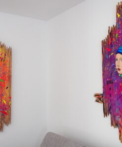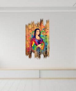 Cette œuvre est une réinterprétation audacieuse de la “Mona Lisa” de Léonard de Vinci, intégrant des éléments modernes et abstraits. Le fond, riche en éclats de couleurs vives, évoque un monde en mouvement, contrastant avec le calme énigmatique du visage de la figure centrale. Les touches vibrantes de rouge, bleu et vert sur sa robe transforment le classique en une explosion contemporaine et dynamique. Les écritures et symboles dispersés dans l’arrière-plan ajoutent une dimension mystérieuse, invitant à l’interprétation personnelle. Le cadre en bois vieilli, où le tableau semble déchiré et débordant, confère une texture brute et organique, renforçant le thème de la juxtaposition entre tradition et modernité. Cette œuvre capte l’esprit tout en rendant hommage à l’original, créant un dialogue visuel entre passé et présent.