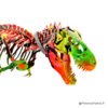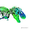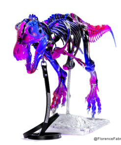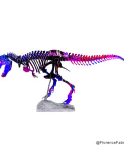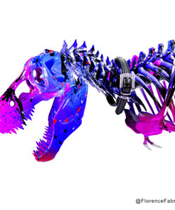 “Voilà quelques années que Florence Fabris souhaitait produire une oeuvre de ce type, Réalisée et assemblée à la main à partir d’impressions 3D, c’est une reproduction fidèle du Tyrannosaurus Rex, chaque os a été imprimé séparément et soudé au reste du corps, Florence l’a ensuite customisé avec une peinture pop art / street art, et lui à ajouté un collier à strass tel un vulgaire animal de compagnie pour l’homme qui en serait capable si les dinosaures n’avaient pas disparus”.
